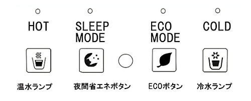SLEEP MODE 光センサーに反応し温水温度が、お部屋が明るい時は約90℃に、暗い時は約65℃に下がり不要な消費を抑えます。 ECO MODE 温水温度が約90℃から約65℃に下がり、節電になります。