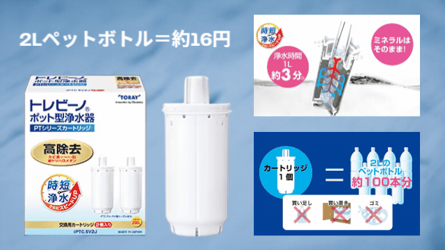カートリッジ(1個は付属)は「TORAY PTC.SV」がご利用できます。 カートリッジは国産の量販品が利用でき、ネットでいつでも購入できます。 2個入りがお得で1個約1600円で毎日2リットルの使用で3か月利用可能です。
